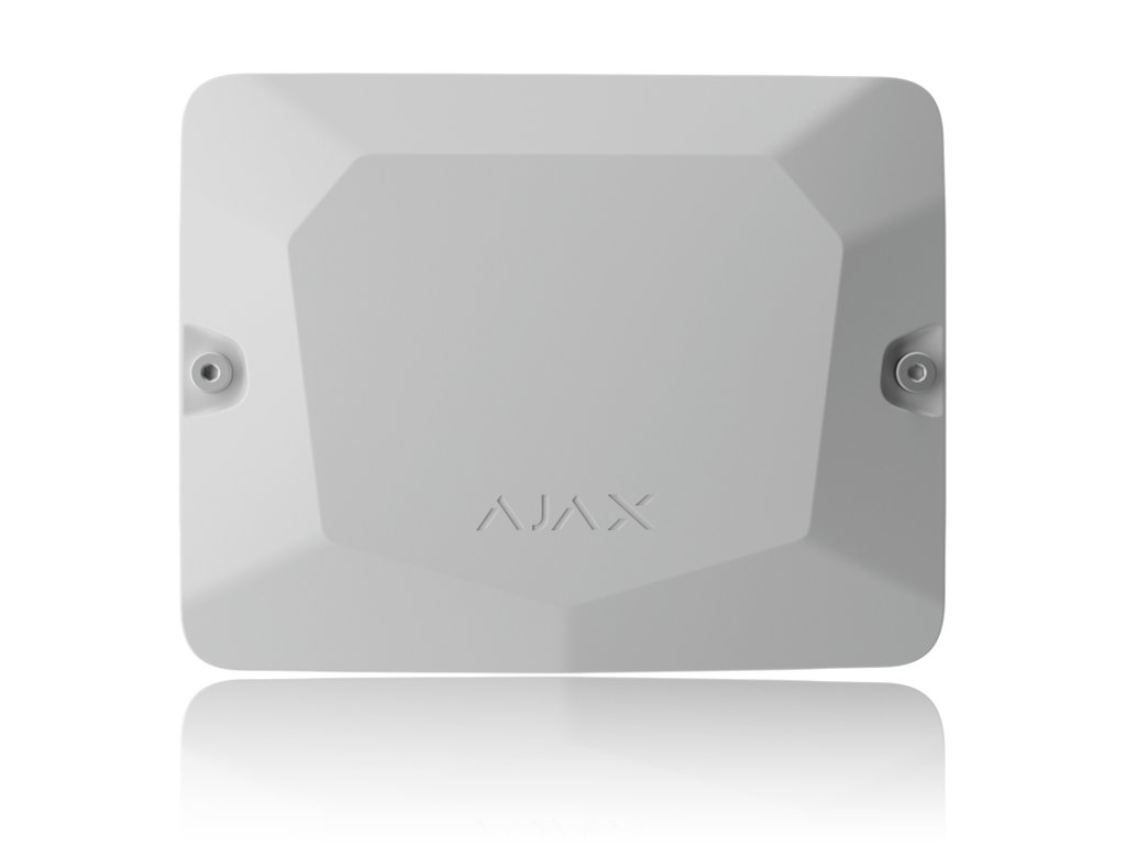 Obudowa Ajax (175 × 225 × 57) - Skrzynka instalacyjna do bezpiecznego połączenia kablowego urządzeń Ajax. Jest to puszka instalacyjna z dwoma gniazdami. WAŻNY! Linia produktów Ajax Fibra jest przeznaczona wyłącznie do instalacji.