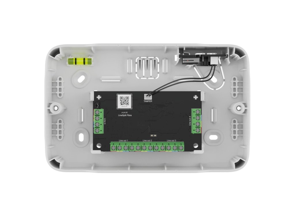 LineSplit jest przeznaczony przede wszystkim do instalacji w specjalnej obudowie Ajax. Pokrywa umożliwia optymalne ułożenie kabli do podłączenia linii Fibra i ma specjalne uchwyty na moduł oraz styk antysabotażowy.