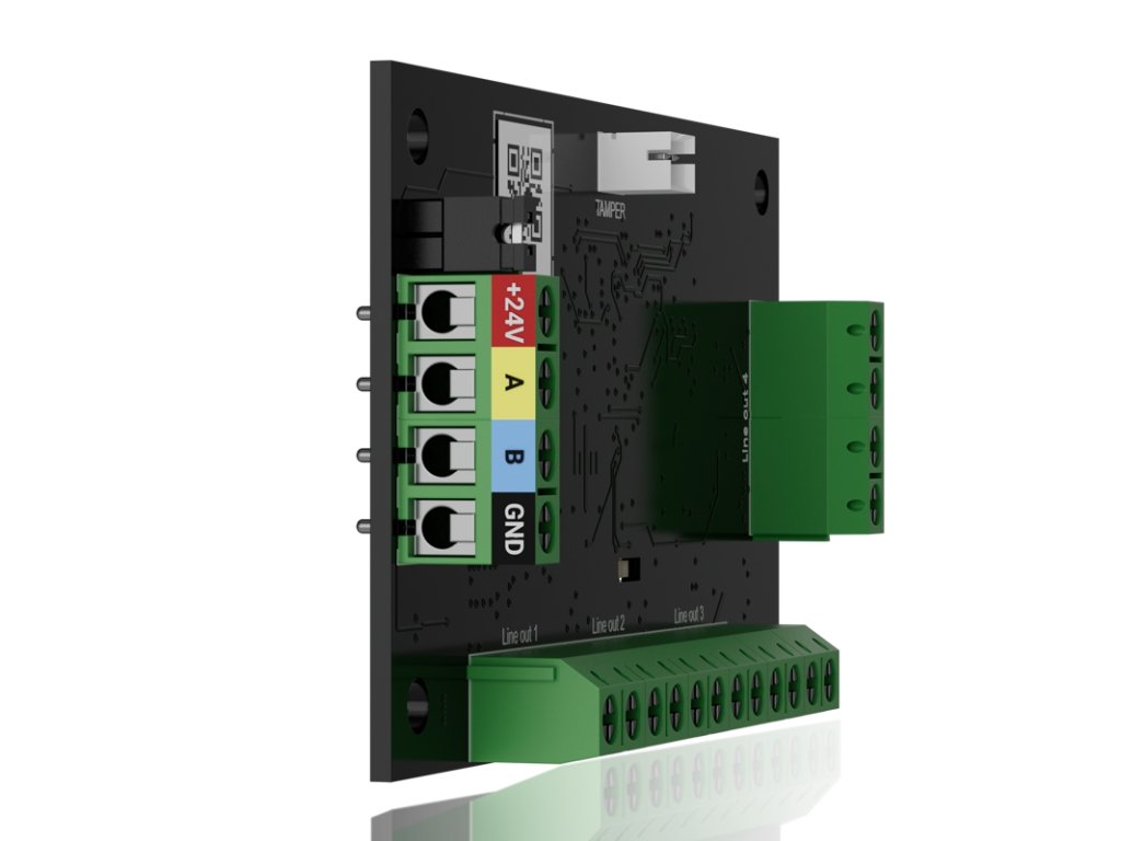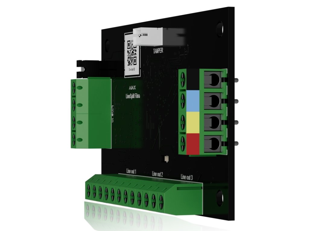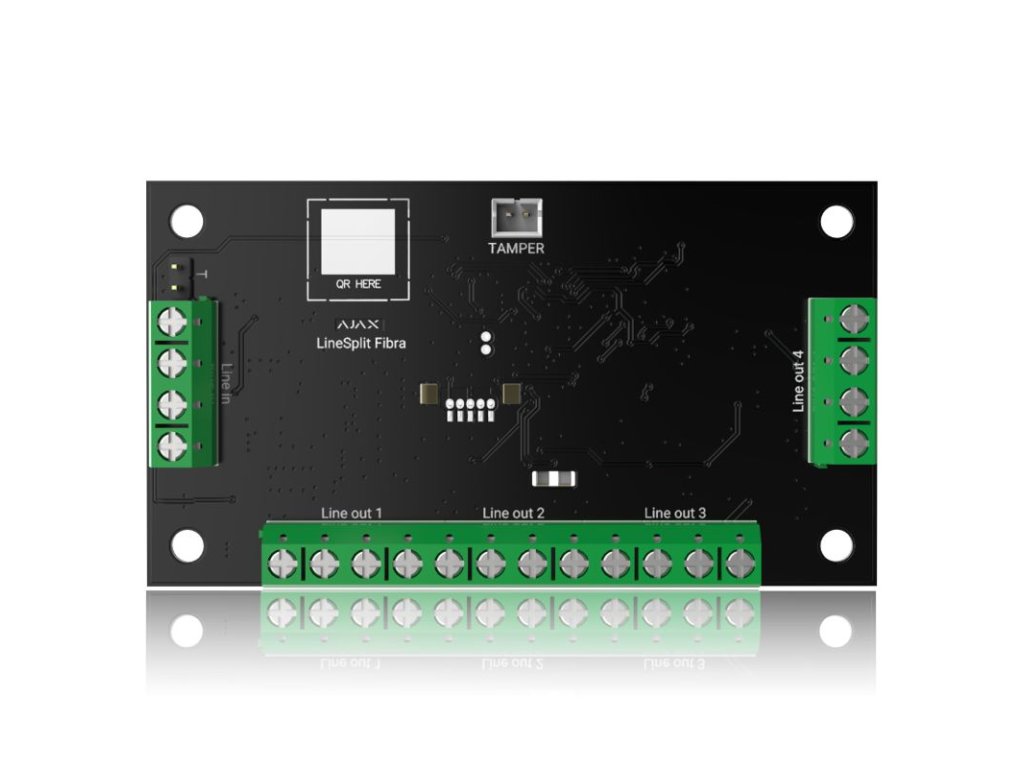 Ajax LineSplit Fibra to moduł, który dzieli jedną linię Fiber na cztery. Każda linia wyjściowa urządzenia może mieć długość do 2000 metrów.