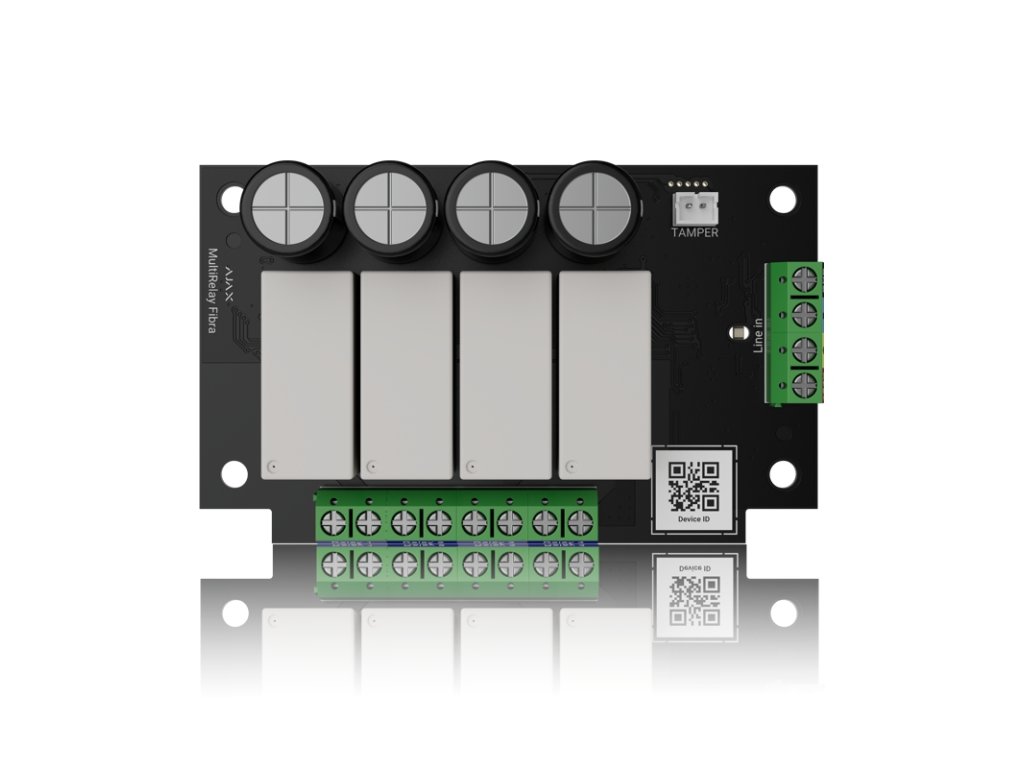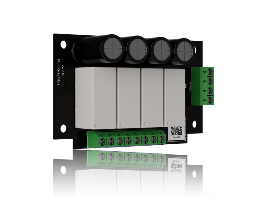 MultiRelay Fibra to moduł do zdalnego sterowania zasilaniem urządzeń elektrycznych. Urządzenie posiada cztery przekaźniki wyjściowe z izolowanymi stykami bezpotencjałowymi. Przekaźniki mogą na przykład sterować zasilaniem urządzeń elektrycznych i innych podłączonych urządzeń. Aby zmienić stany poszczególnych przekaźników, użyj aplikacji Ajax, stwórz scenariusze automatyzacji lub naciśnij przycisk.