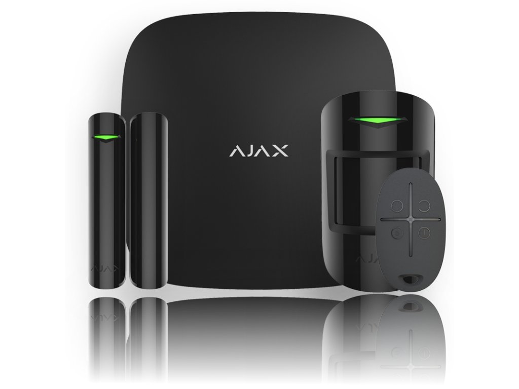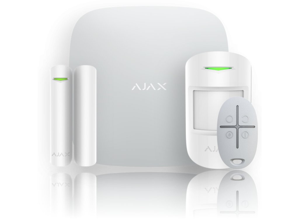Zestaw zawiera panel sterowania Ajax Hub Plus z obsługą Wi-Fi, czujnik PIR MotionProtect, kontaktron magnetyczny DoorProtect i pilot SpaceControl.