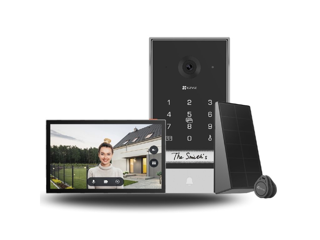 Ezviz EP7 - domowy wideodomofon wyposażony w 7" wyświetlacz LCD, zewnętrzną jednostkę kamerową z klawiaturą i czytnikiem RFID oraz panel słoneczny. Umożliwia bezprzewodowe połączenie jednostki zewnętrznej i wewnętrznej. Posiada połączenie Wi-Fi i komunikuje się z aplikacją Ezviz.