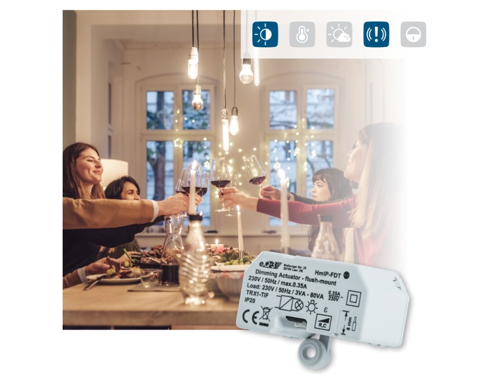 Programowalny bezprzewodowy Ściemniacz Akcyjny (HmIP-FDT) do montażu ukrytego, zasilany z sieci 230 V, jest częścią systemu inteligentnego domu Homematic IP.