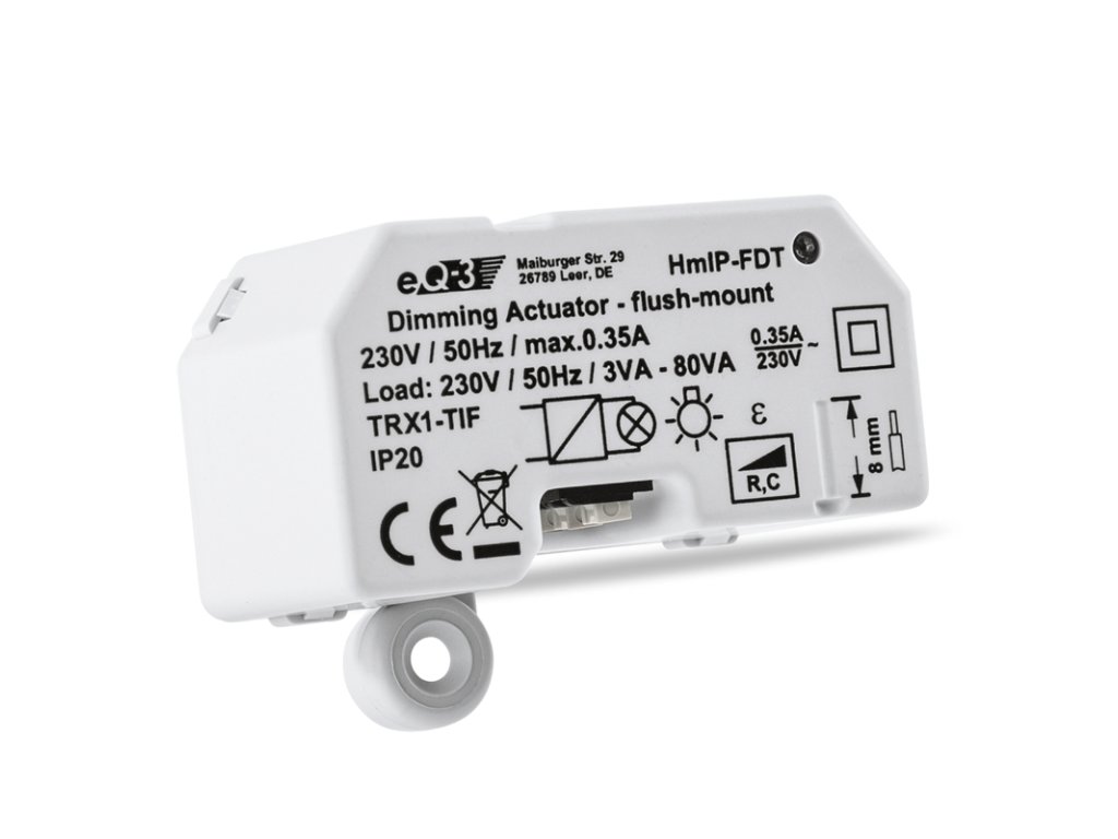 Ściemniacz Akcyjny (HmIP-FDT) montuje się w standardowej puszce instalacyjnej podtynkowej lub w puszce do montażu powierzchniowego z połączeniem do sieci 230 V. Bezprzewodowa komunikacja umożliwia instalację bez potrzeby dodatkowego okablowania. Oznacza to, że urządzenie można umieścić w miejscu gotowego lub istniejącego połączenia elektrycznego w sieci 230 V.