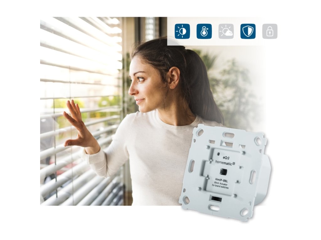 W połączeniu z czujnikami meteo (HmIP-SWO-x) można zautomatyzować zaciemnianie w zależności od poziomu jasności lub podnieść rolety i żaluzje w przypadku przekroczenia ustawionej wartości prędkości wiatru. Zawiera również ochronę przed uderzeniem, która uniemożliwia opuszczenie żaluzji lub rolet, gdy okno jest otwarte.