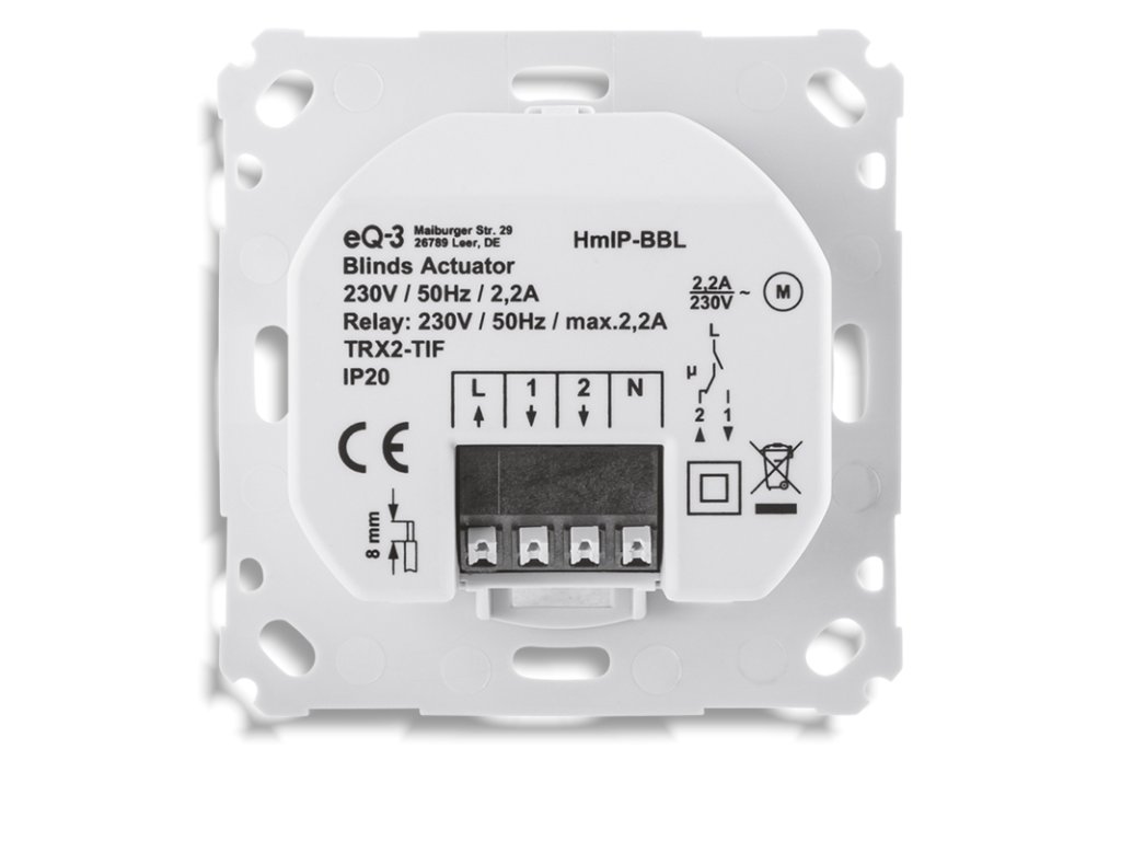 Programowalny bezprzewodowy człon wykonawczy żaluzji (HmIP-BBL-2) do montażu podtynkowego, zasilany z sieci 230 V, stanowi część systemu inteligentnego domu Homematic IP.