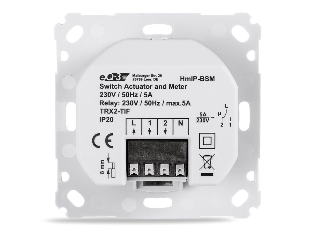 Przełącznik wykonawczy (HmIP-BSM) montuje się w standardowej puszce wpustowej pod tynkiem z podłączeniem do sieci 230 V. Bezprzewodowa komunikacja umożliwia instalację bez potrzeby dodatkowego okablowania. Oznacza to, że urządzenie może być zamontowane w miejscu, w którym już istnieje połączenie z siecią elektryczną 230 V.