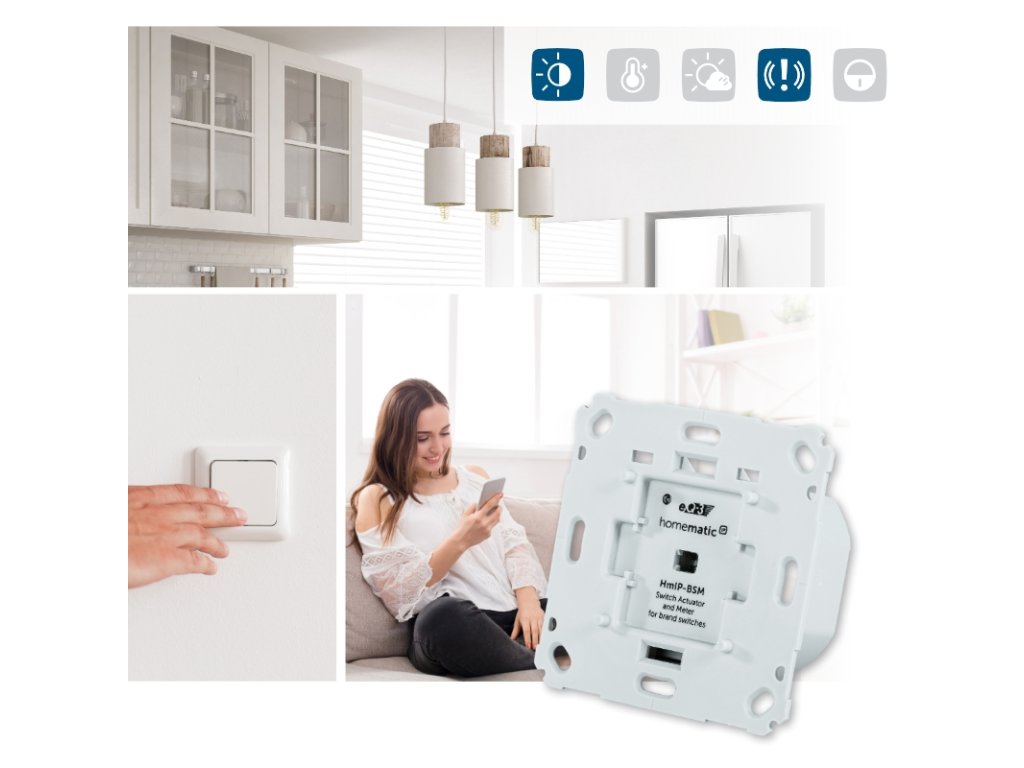 Połączenie przełącznika wykonawczego (HmIP-BSM) z centralną jednostką (HmIP-HAP) umożliwia wygodne ustawienie i sterowanie kompleksowym systemem inteligentnego domu Homematic IP za pomocą intuicyjnej aplikacji (dla Androida i iOS w wersji CZ) przeznaczonej na smartfony. Aplikacja mobilna Homematic IP umożliwia natychmiastową reakcję na wiadomości i powiadomienia z systemu inteligentnego domu oraz łączy wszystkie urządzenia Homematic IP za pośrednictwem darmowej, nieograniczonej chmury, co pozwala na konfigurację i zarządzanie systemem z dowolnego miejsca na świecie, przesyłanie ważnych informacji, aktualizację oprogramowania i firmware’u urządzeń, oraz przekazywanie poleceń konfiguracyjnych i operacyjnych z aplikacji Homematic IP do poszczególnych urządzeń inteligentnego domu.