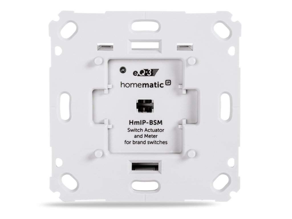 Programowalny bezprzewodowy przełącznik wykonawczy z pomiarem (HmIP-BSM) do montażu wpustowego, zasilany z sieci 230 V, jest częścią systemu inteligentnego domu Homematic IP.