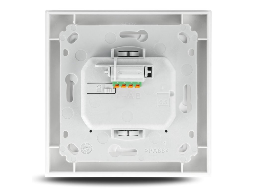 Dołączona płyta montażowa jest zoptymalizowana pod kątem łatwego montażu w puszce natynkowej. Wyjmowana zacisk push-in ułatwia podłączenie do szyny kablowej.