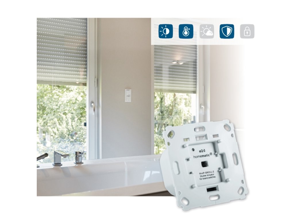 - W połączeniu z czujnikami meteologicznymi (HmIP-SWO-x) można zautomatyzować zaciemnianie w zależności od poziomu jasności lub podnieść rolety w przypadku przekroczenia ustawionej wartości prędkości wiatru. Zawiera także ochronę przed przypadkowym zamknięciem, która uniemożliwia opuszczenie rolet, gdy okno jest otwarte.