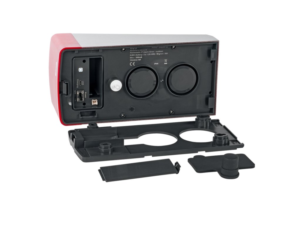Bezprzewodowa solarna syrena (HmIP-ASIR-O) przeznaczona jest do użytku na zewnątrz i stanowi część systemu inteligentnego domu Homematic IP. Umożliwia niezawodną akustyczną i wizualną sygnalizację alarmową. W tym celu syrena posiada dwa wydajne piezoelektryczne głośniki o natężeniu 100 dB oraz pięć bardzo jasnych diod LED, które są umieszczone w obudowie odpornej na warunki atmosferyczne z klasą ochrony IP44.