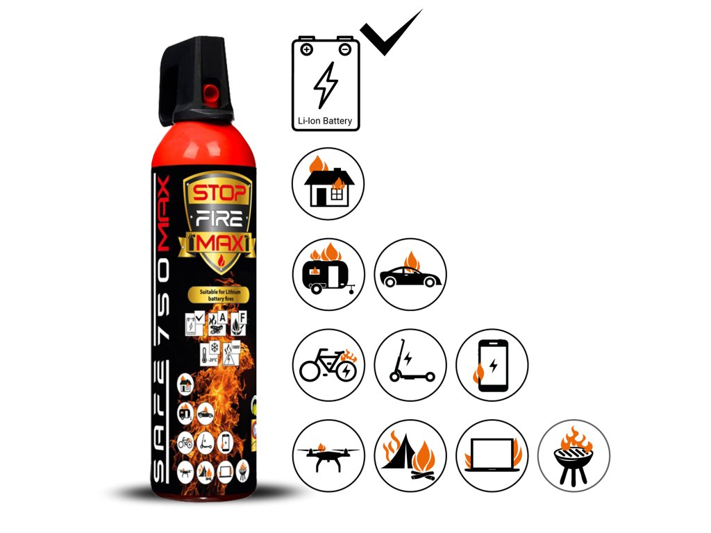 Uniwersalny spray gaśniczy SAFE 750 MAX odpowiedni również do gaszenia początkowych pożarów BATERII LITOWYCH oraz certyfikowany do gaszenia pożarów klasy A (materiałów stałych), F (olejów i tłuszczów spożywczych), E (baterii litowych do 100 Wh oraz urządzeń elektrycznych pod napięciem do 1000 V). Przeznaczony jest przede wszystkim do gaszenia początkowych pożarów w domach, kuchniach, garażach, samochodach, biurach, domkach letniskowych itp.