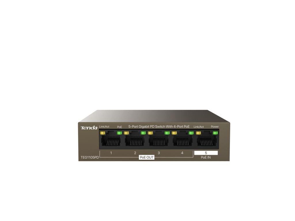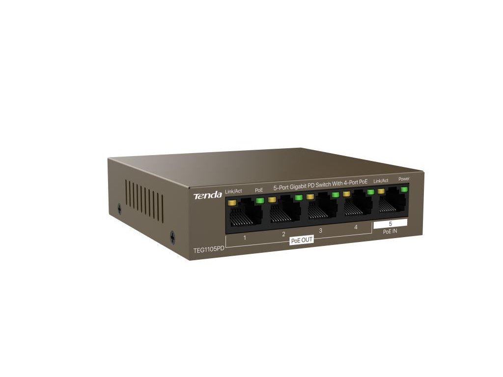 Tenda TEG1105PD to 5-portowy przełącznik Gigabit Ethernet PoE. Zasilany jest za pomocą PoE, a jednocześnie zasila inne urządzenia poprzez PoE. 1 port służy do zasilania przełącznika, a pozostałe 4 porty PoE 10/100/1000 Mb/s obsługują PoE 802.3af (łącznie 4 porty 30 W). Fanless, bez wentylatora.