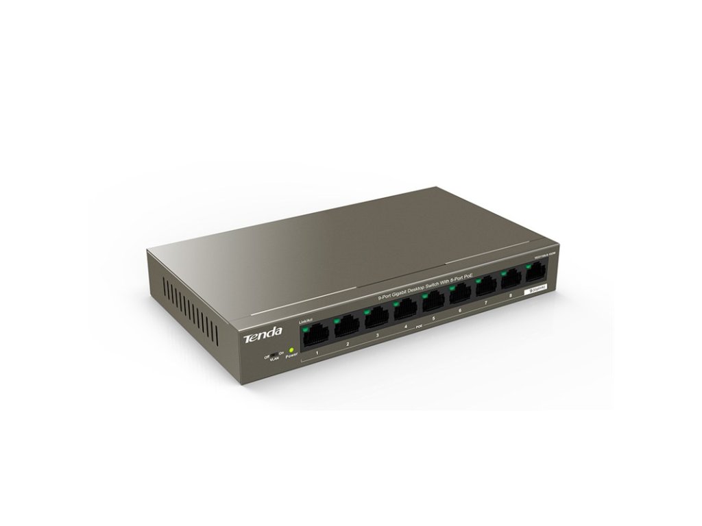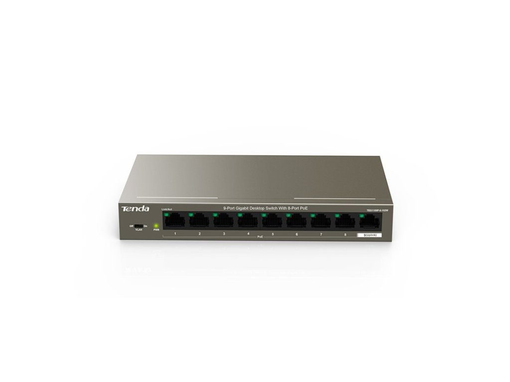 Tenda TEG1109P-8-102W przełącza dane za pomocą 9 portów RJ45 z prędkością 10/100/1000 Mb/s z automatycznym wykrywaniem prędkości. Jeden port służy do Uplink, a 8 portów PoE obsługuje PoE 802.3af i 802.3at. Przełącznik obsługuje stabilne zasilanie PoE ośmioma rdzeniami, ochronę przed przepięciami 6 kV. Obsługuje przełączanie w trybie Store-And-Forward, a także wsparcie dla Cut-through oraz Wire-speed forwarding. Kontrola przepływu Full-duplex 802.3x, kontrola przepływu w trybie Half-duplex w trybie Back-Pressure.