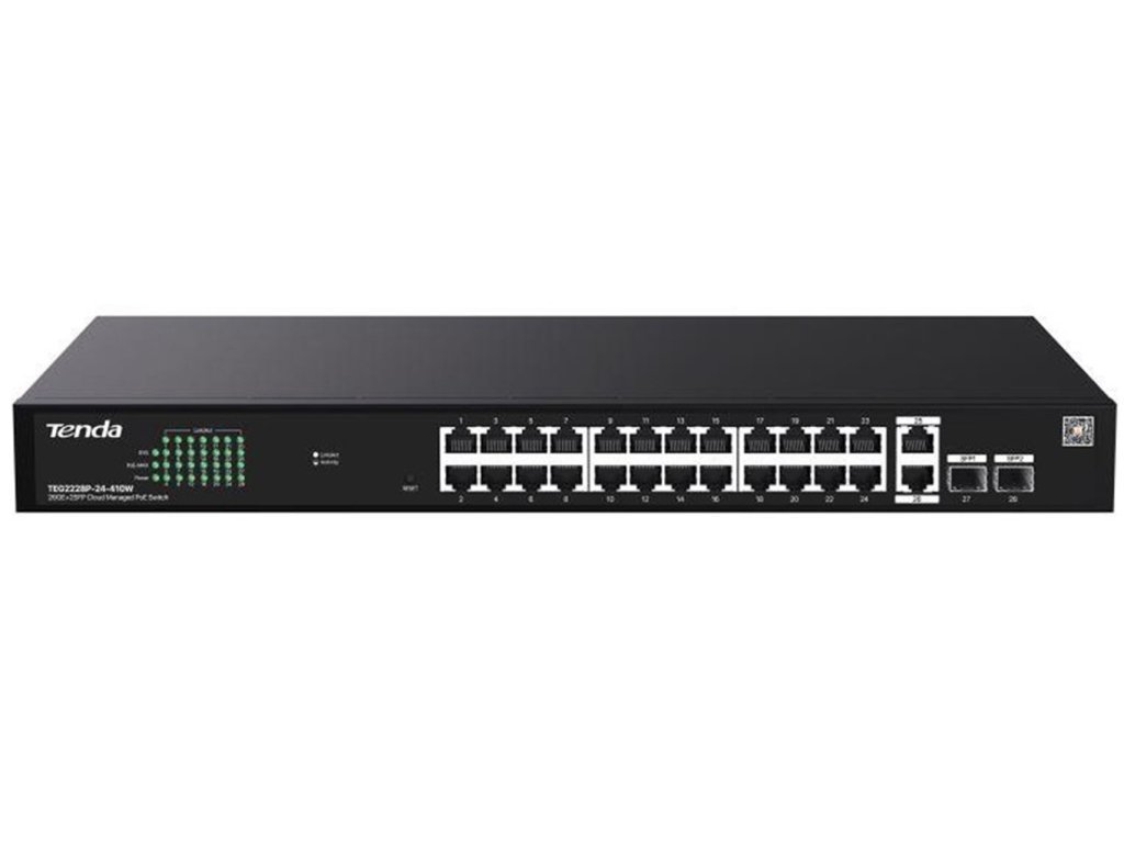 Tenda TEG2228P-24-410W to 26-portowy gigabitowy przełącznik PoE L2 Websmart + Cloud. 24× 10/100/1000 Mb/s PoE 802.3af/at (łącznie 370 W) + 2× SFP 1000 Mb/s. Obsługuje zarządzanie przez sieć WWW i chmurę, QVLAN, IGMP, DHCP snooping, klienta DHCP, IGMP fast leave, Storm control, Anti-ring, ograniczenie prędkości, port mirroring oraz agregację. Wykonanie rackmount. W zestawie znajduje się instrukcja w języku polskim, czeskim i słowackim.